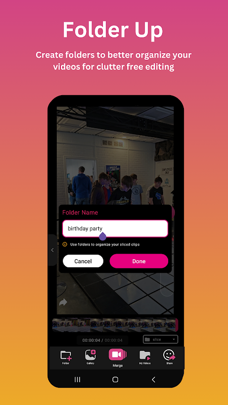 Twórz i dostosowuj foldery, aby uporządkować swoje klipy wideo w mediach społecznościowych. Niezależnie od tego, czy są to niezapomniane wycieczki, zabawne chwile ze zwierzętami, wydarzenia sportowe czy spotkania rodzinne — Slice pomoże Ci uporządkować każdą chwilę i przygotować ją do udostępnienia.