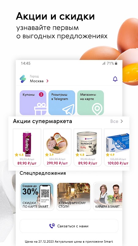 Smart to aplikacja dla klientów sklepów Smart w Moskwie, Niżnym Nowogrodzie, Leningradzie, Iwanowie, Włodzimierzu, Kałudze, Jarosławiu, Ryazan, obwodach Kirowskich, Republikach Tatarstanu, Mordowii, Czuwaszji i Mari El. Ponad 2500 ulubionych produktów wysokiej jakości w niskich cenach. Inteligentnie – niskie ceny za lepsze życie!