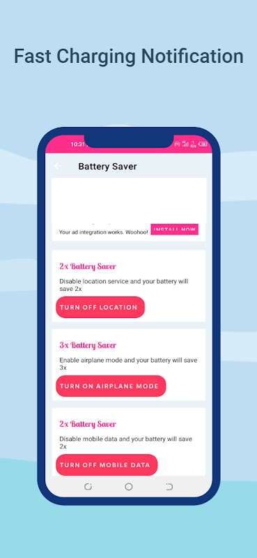 When you plug in the charger, you just need to press the "Fast Charging" button to activate it. The application also turns off battery draining services and connections such as Wifi, Bluetooth, Auto Sync. Reduce screen brightness, Let your screen turn off sooner, Turn off keyboard sounds or vibrations... according to the user's favorite settings.