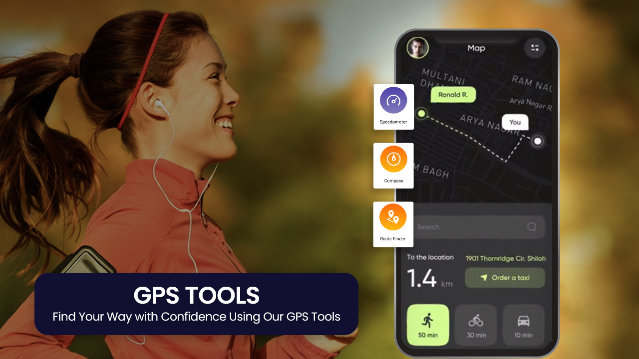 Narzędzia GPS są zwykle zintegrowane z Smart Tools: Utilities Tools, za pomocą których można uzyskać dostęp do wszystkich narzędzi GPS, takich jak kompas, prędkościomierz, wyszukiwarka tras, pogoda i w pobliżu itp.
