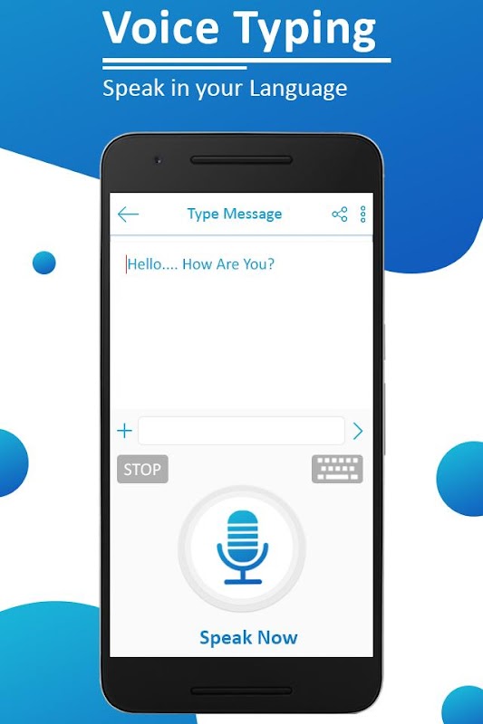 Voice typing is a simple app and user friendly application. The text appears after you done Talking . Once you get the regularity, you can use the app and send ,share long textes and articles in other social media and many messaging application such as Watsapp, Viber, Skype , note tha voice typing Supports more than 70 different languages.
