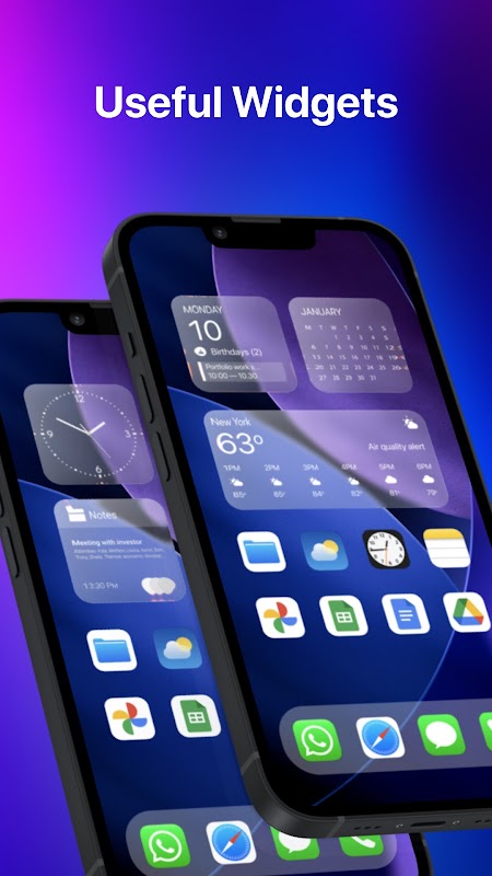 - Szeroki wybór widżetów inspirowanych iOS (zegar, kalendarz, pogoda, X-Panel i inne)