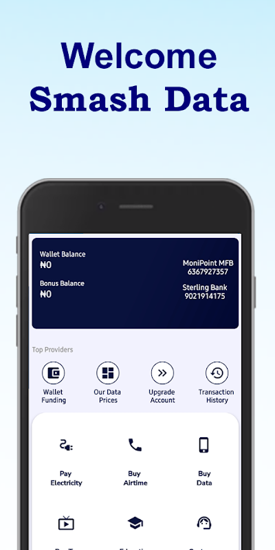 Dzięki aplikacji Smash Data możesz kupować i sprzedawać różnego rodzaju niedrogie i najtańsze pakiety danych wszystkich dostawców sieci, takich jak: MTN, Airtel, Glo, 9Mobile i Smile; w Nigerii.