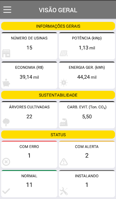 É possível visualizar a todo momento a produção solar, consumo de energia e as economias alcançadas.