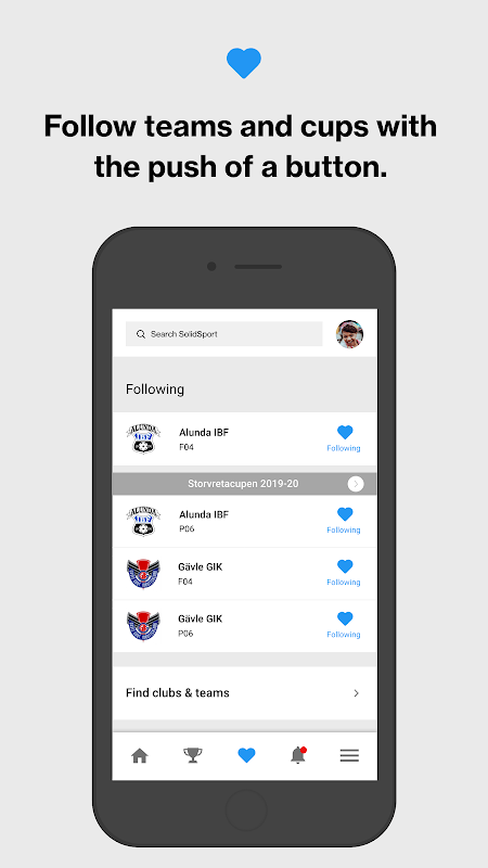 Dzięki funkcji wyszukiwania w aplikacji możesz znaleźć drużynę, stowarzyszenie lub puchar, którego szukasz. W Solidsport jest kilka tysięcy transmisji ze wszystkich możliwych drużyn i stowarzyszeń.