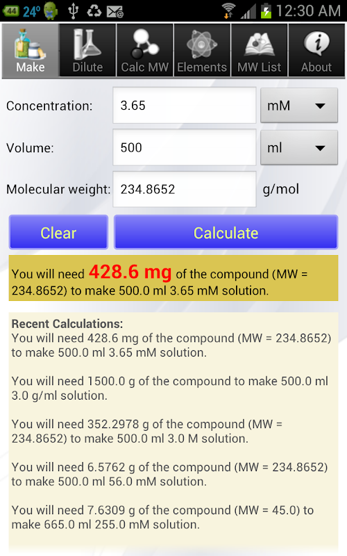 (1) ma doskonałą kalkulatora wytwarzania roztworów chemicznych do rozcieńczania roztworów używając roztworu podstawowego. To pomaga szybko ustalić, ile roztwór chemiczny / akcji trzeba. Nie ma potrzeby, żeby poeksperymentować z kalkulatorem i mogą spędzić więcej czasu w swoim studiów lub badań.