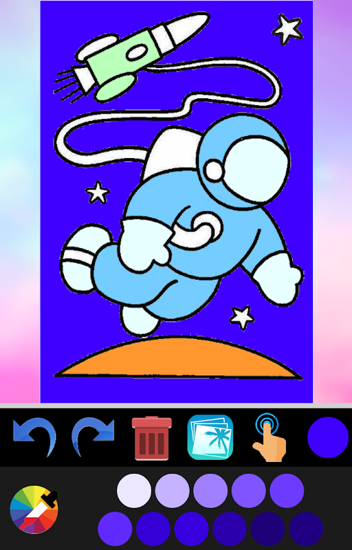 Istnieje wiele przycisków, które można wykorzystać w aplikacji do gry, aby pokolorować ten fajny i zabawny obraz kosmiczny