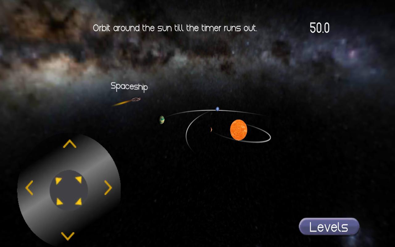 Space orbit gravity game has 10 levels to begin with. First five levels are totally about gravity game involving gravity defied stunt. You learn how to control your spaceship in intense gravity and remain in orbit. You move your spaceship with a virtual joystick on the left of the screen to attain proper speed so that the spaceship enters into orbit around the sun and perform a gravity defied stunt. Don't go too fast or you will be lost in the vastness of space and if you go to slow you will be pulled into the sun's gravity.