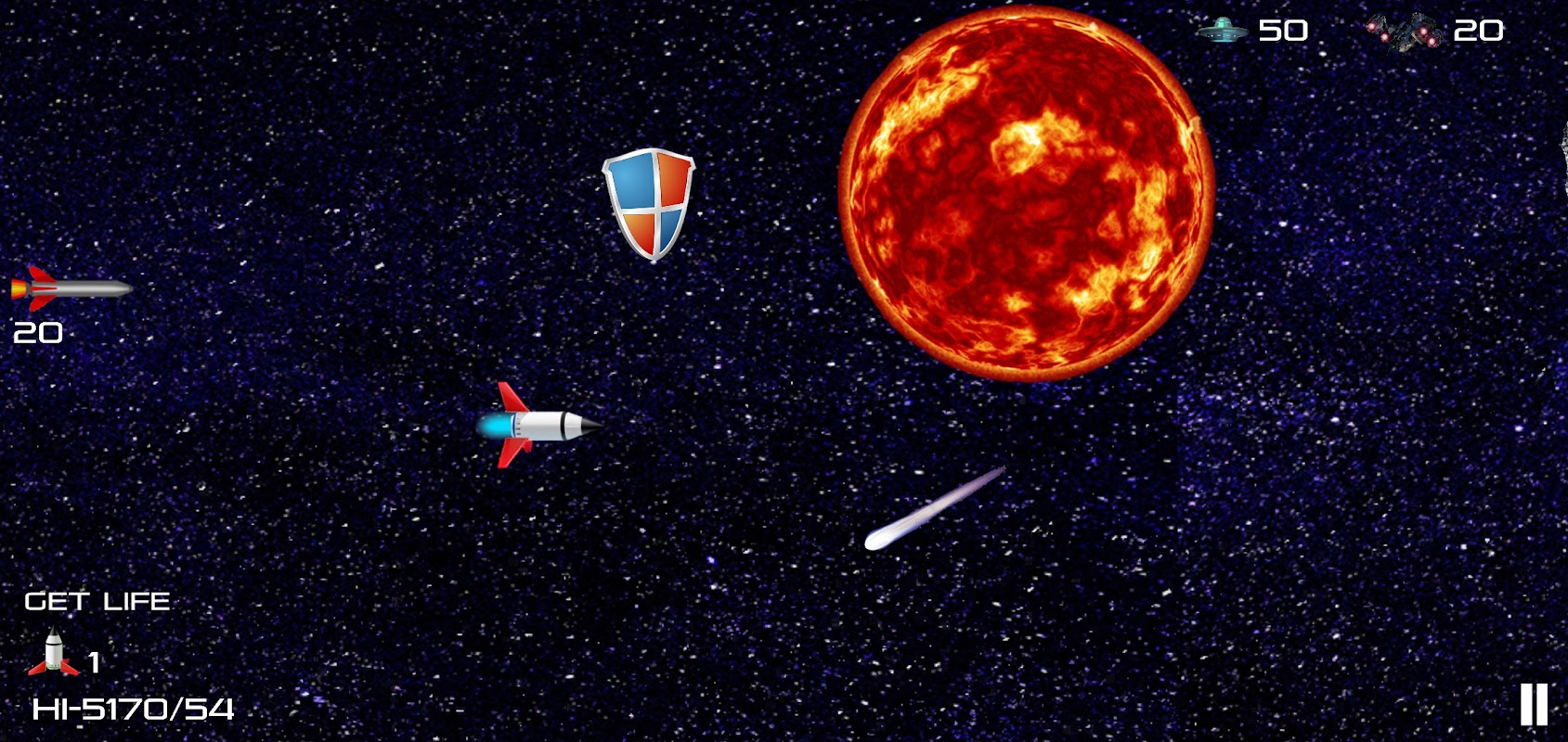 Rozgrywka na poziomie 1: Twój statek kosmiczny leci w stronę obcej planety. Twoim celem jest niszczenie lub omijanie przeszkód kosmicznych, takich jak asteroidy, komety i inne planety, aby uniknąć kolizji ze statkiem kosmicznym, a także walka z obcymi UFO i okrętami wojennymi. Specjalne moce będą często dostępne w celu ochrony statku kosmicznego, takie jak tarcza asteroidy i bańka energii. Dostępne są pociski do niszczenia celów. Na koniec walcz z super bossem (potężnym wrogim statkiem), zniszcz go, aby dotrzeć na wrogą planetę. Każdy obiekt, którego unikniesz lub zniszczysz, zwiększy Twój wynik. Podczas lotu podziwiaj niesamowite widoki gwiazd, spadających gwiazd, galaktyk, mgławic, różnych planet, czarnych dziur i tuneli czasoprzestrzennych. Możesz zatrzymać grę w dowolnym momencie, aby zdobyć specjalne moce, pociski i dodatkowe życie.