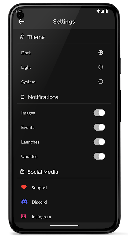 Możesz przeglądać aplikację zarówno w trybie ciemnym, jak i jasnym (lub nawet w trybie domyślnym systemu). Dzięki temu możesz także wybrać, które powiadomienia chcesz otrzymywać.
