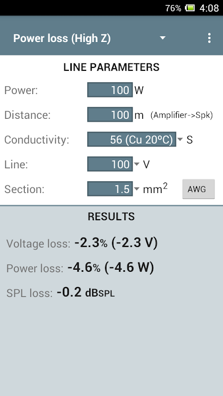 Oblicz sekcje, straty mocy i innych parametrów linii głośnikowych. HZ / LZ