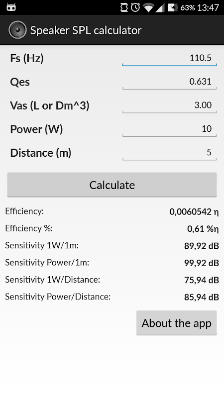 obliczanie efektywności i czułości głośnika z Thiele małych wartościach