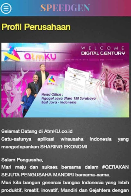 SpeedGen memiliki Visi dan Misi agar tercipta para Pengusaha Digital AtmKU.co.id menjadi entrepreneur mandiri dan sukses secara signifikan melalui Bisnis Konsep Sharing Ekonomi.