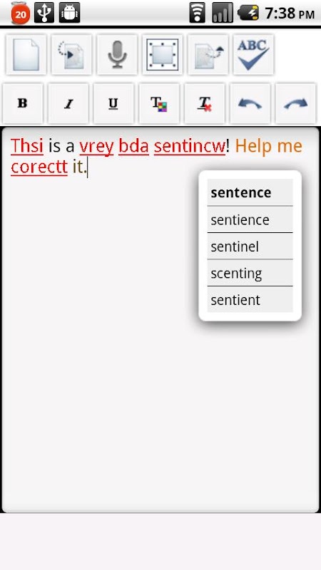 Wpisz, co chcesz z pełną kontrolą edytora, a następnie sprawdzić pisownię go bez ograniczeń liczby tekst do sprawdzenia. Modyfikowanie błędy ortograficzne, a następnie wysłać tekst do dowolnej aplikacji, która zaakceptuje go jak e-mail, SMS lub dowolnej sieci społecznej.