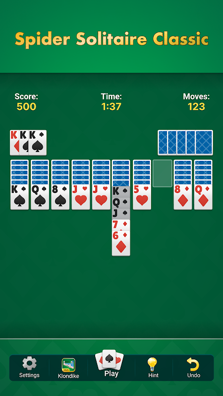 • Klasyczna rozgrywka w pasjansie Spider z płynnymi i czytelnymi kartami