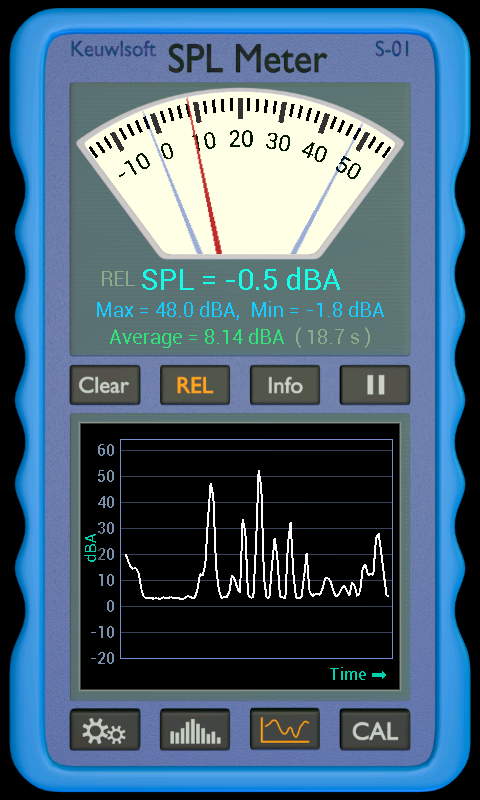 Miernik poziomu ciśnienia akustycznego. Ta aplikacja wykorzystuje mikrofon do wykrywania dźwięku i przekształcenia go w wartości SPL. Wyłącznie informacji. Wyniki zależą od urządzenia i jego sprzętu. Zakres od szumów i nasycenia może być tylko 20 dB na najgorszych urządzeń, ale może przekroczyć 100 dB na najlepszych urządzeń.