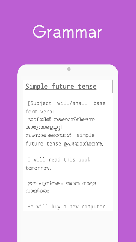 Aplikacja skupia native speakerów malajalam, którzy lubią mówić po angielsku do wyrażania swoich pomysłów. Malajalam Spoken English aplikacja jest wyposażony w szeroką gamę funkcji, w tym nauki i metody praktyką. Pomoże Ci zrozumieć podstawowe cegiełki języku angielskim. Aplikacja łączy wszystkie regularne spożywczych do nauki języka, jak czasy, czasowniki modalne, czasowniki, rzeczowniki itp Poza tym dostaniesz możliwość uzyskania prawidłowych wymowy zdań z użyciem silnika dźwięku. Opcja ta metoda praktyki przekłada zdań języka angielskiego na język malajalam.
