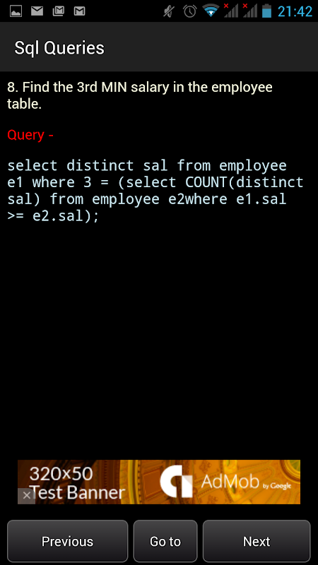 1.This is basic app for learning SQL queries which are frequently asked in SQL exams or interview.
