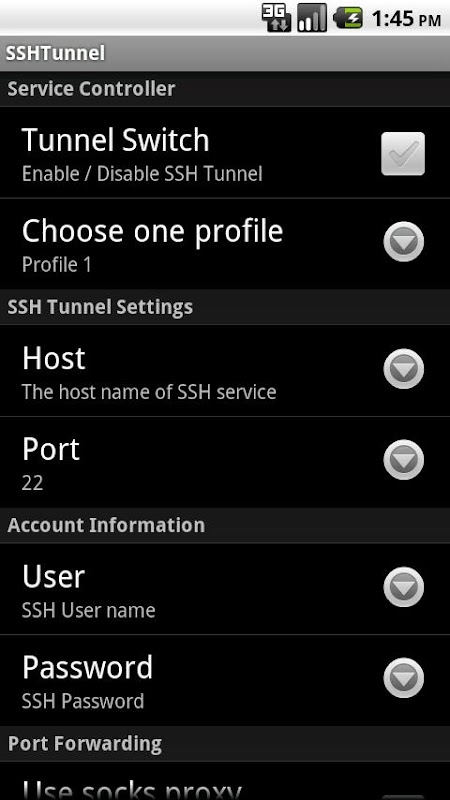 SSHTunnel is a SSH tunnel app for Android System. With this app and a configured server (typically configured with sshd and nginx / squid), you can easily browse internet through a SSH tunnel on your android devices.