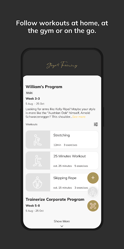 Dzięki aplikacji szkoleniowej Stage 4 będziesz mieć dostęp do programów treningowych opracowanych specjalnie, aby pomóc Ci osiągnąć cele w zakresie sprawności i zdrowia! Możesz śledzić i monitorować swoje treningi, odżywianie, nawyki związane ze stylem życia, pomiary i wyniki – a wszystko to z pomocą swojego trenera.