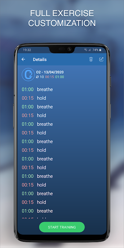 Każde ćwiczenie można edytować, ustawiając własną liczbę powtórzeń, czas wstrzymania oddechu, czas odpoczynku itp.