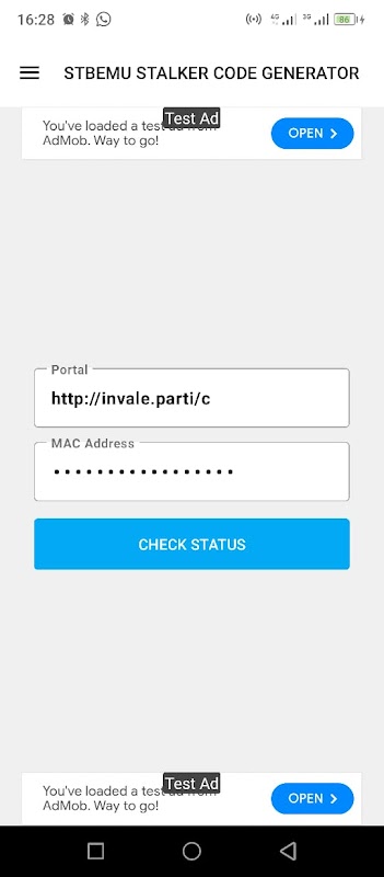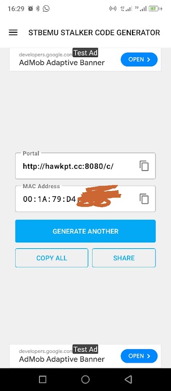 Generowanie danych uwierzytelniających: Aplikacja zapewnia niezbędny adres URL portalu i adres MAC ($00:1A:79:...$).