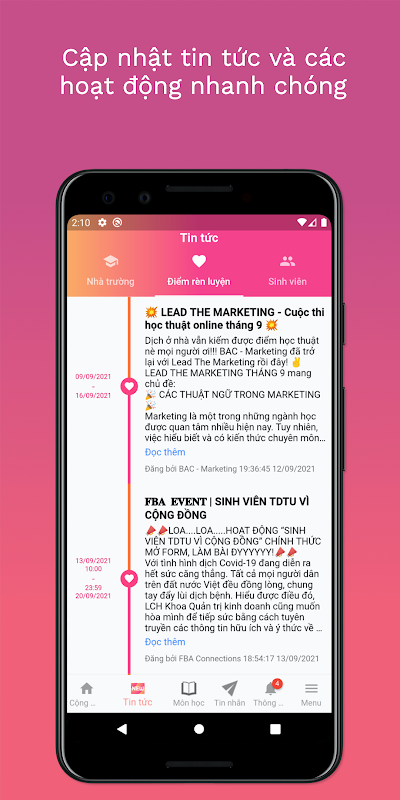 Ứng dụng giúp sinh viên kết nối với nhau, nhanh chóng nắm bắt các thông tin cần thiết, thú vị. Ứng dụng cũng là nơi chia sẻ tài liệu học tập và rất nhiều các tiện ích khác.