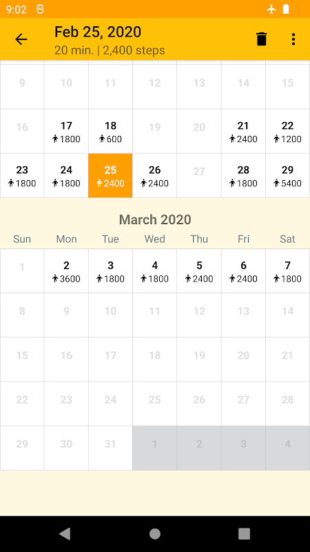 Kalendarz historii ćwiczeń pokazuje czasy ćwiczeń lub kroki w przeszłości według dat.