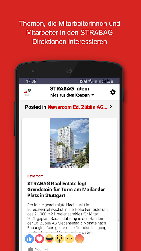Mit STRABAG Intern informieren sich Mitarbeiterinnen und Mitarbeiter über Geschehnisse in den Direktionen und Neuigkeiten im Konzern. Die Applikation kann nur mit Benutzername und Passwort genutzt werden. Mitarbeiterinnen und Mitarbeiter werden von ihren Direktionen informiert.
