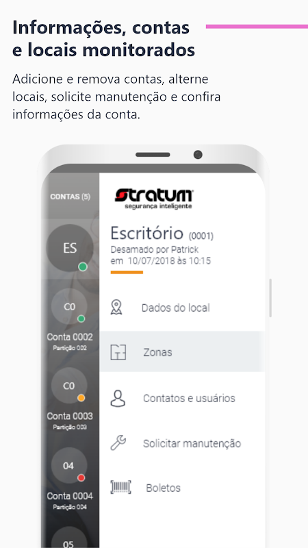 Stratum to aplikacja mobilna, w której monitorowany klient może bezpośrednio monitorować wszystkie działania swojego systemu bezpieczeństwa za pośrednictwem telefonu komórkowego lub tabletu. Dzięki aplikacji możesz poznać stan panelu alarmowego, uzbroić go i rozbroić, przeglądać kamery na żywo, sprawdzać zdarzenia i otwierać zlecenia pracy, a także nawiązywać połączenia telefoniczne z kontaktami zarejestrowanymi w Twoim profilu. To bezpieczeństwo, którego potrzebujesz w dłoni.