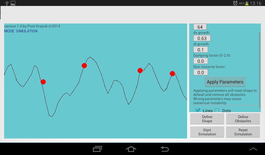Należy być ostrożnym przy ustalaniu parametrów. Zbyt wielkie wartości lub pewne kombinacje wartości parametrów mogą spowodowqać niestabilność numeryczną (np: duży współczynnik nieliniowości: 2.0