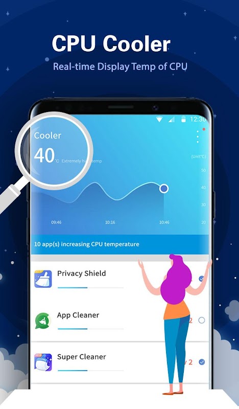 Check phone temperature & close useless background apps. Super Clean frees more CPU spaces and enables your phone to run other apps quicker and better. No more lagging phones.