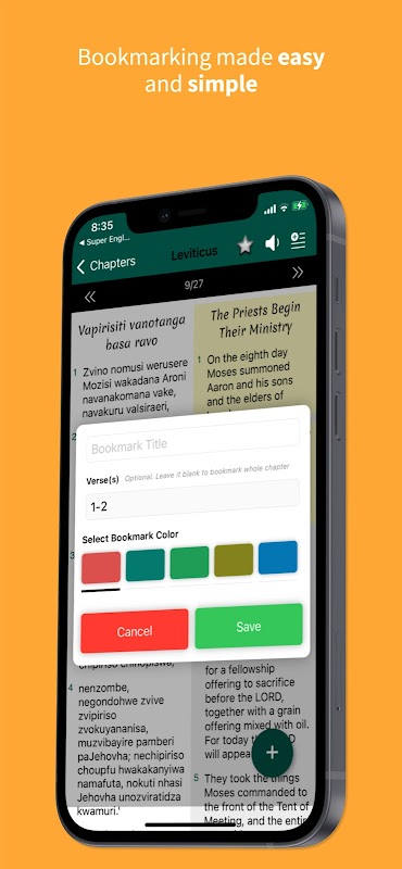 - Opcja zakładki z dodanymi ładnymi funkcjami. Możesz dodać zakładkę do całego rozdziału, jak Księga Rodzaju: 5, możesz także dodać do zakładek określone wersety, jak Łukasz 5: 3-6 i Mateusz: 3: 4,6,12.