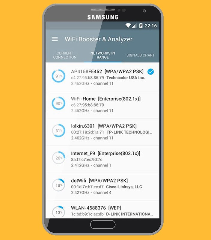 With WiFi adapter enabled, WiFi analyzer scans all available wireless networks in range and shows you information about them, such as: