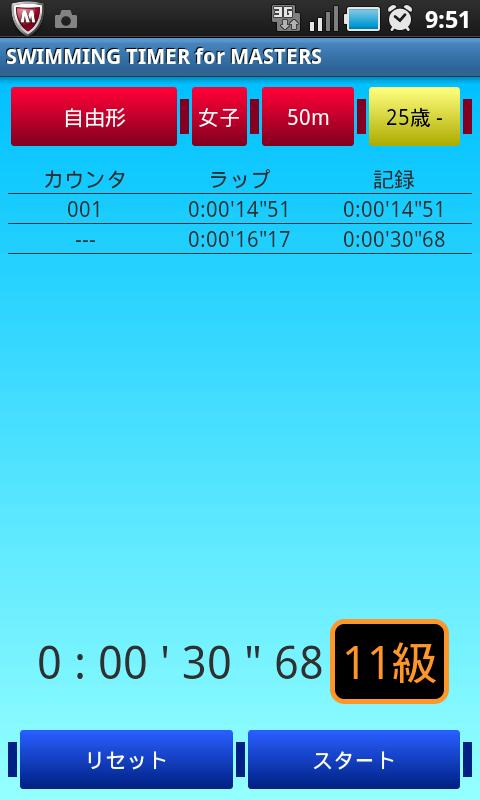 マスターズ水泳のための総合アプリ。計測時に資格級を表示。世界記録や日本記録も閲覧可能。保存やメールでの送信もでき、記録管理に最適なアプリ。