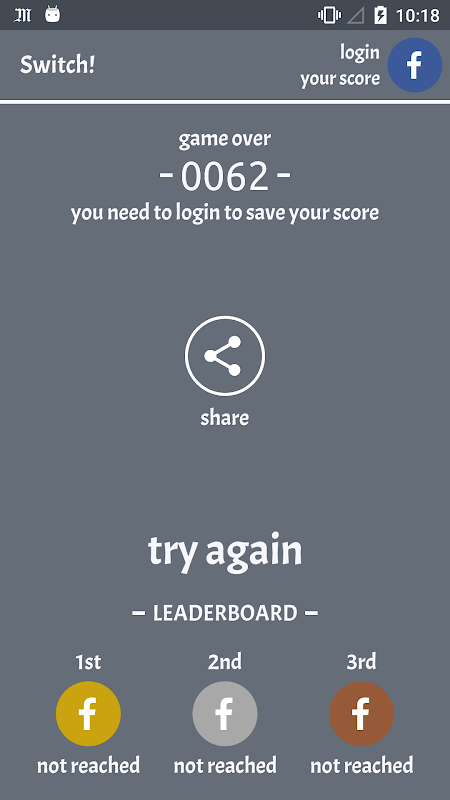 A very simple game that will help you improve your reflexes. Tap switches in time, avoid red ones. If you wait too long and miss a green switch, you loose. If you tap on a red switch, you loose.