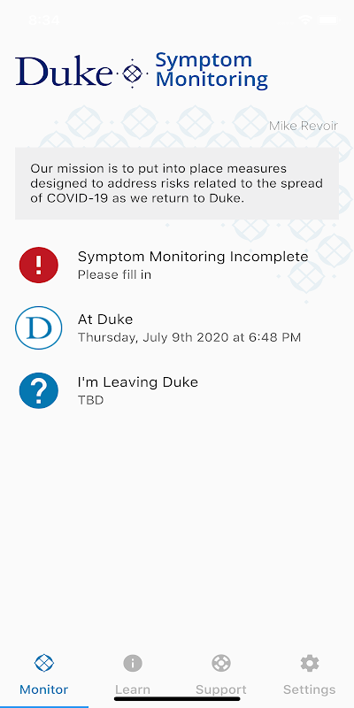 SymMon pomaga Duke University pomagać studentom, wykładowcom i personelowi zachować bezpieczeństwo i zdrowie po powrocie do Duke. Aplikacja może być używana do uproszczenia wymaganych codziennych raportów monitorowania objawów i dostarcza informacji społeczności Duke.