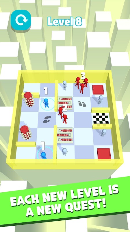 The simplest game in which you need to solve a quest in a small room. Swipe the screen to guide the blue men through the maze and come to the exit. Collect as many stickmen as possible in your team - by connecting them, do not forget about the gray stickmen - they can join you!