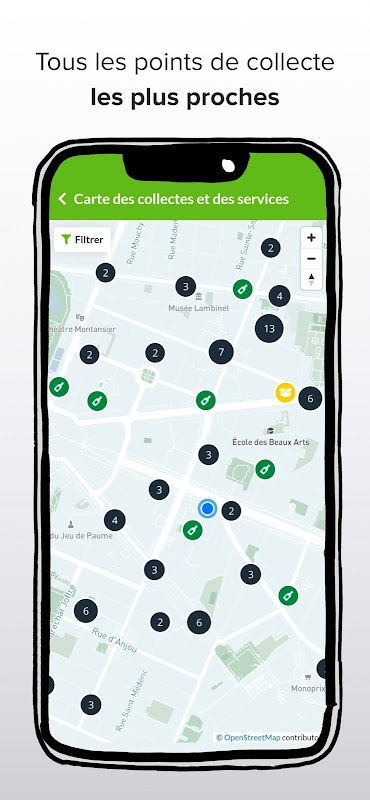 Aplikacja identyfikuje najbliższe punkty zbiórki za pomocą geolokalizacji i podaje zasady sortowania oraz instrukcje, których należy przestrzegać dla każdej usługi (szkło, tekstylia itp.). Nie będziesz już miał żadnych wątpliwości co do lokalizacji punktu zbiórki czy godzin otwarcia centrów recyklingu: właściwe informacje znajdziesz w aplikacji!