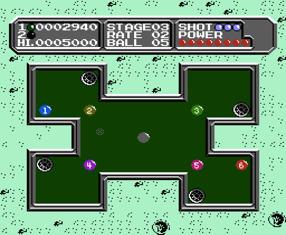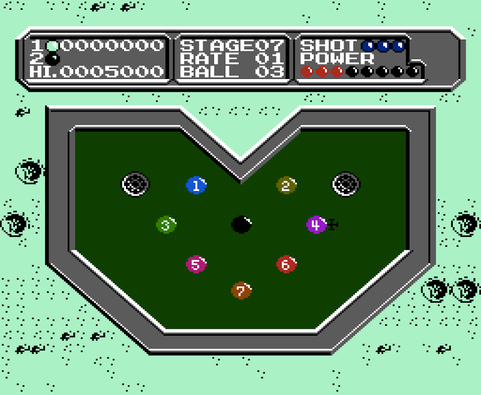 Combines mini golf with pool (pocket billiards), in which each stage is a differently shaped pool table. The object is to knock each ball into a pocket using a cue ball. There are sixty levels to choose from, and the friction of the table is adjustable.