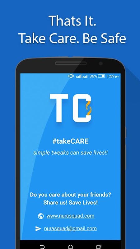 With this application, it is easier for unknowns to recognize you and keep your emergency contacts notified as an SOS. Thank you for your passion in Take Care application. We will make it available soon for iphone and windows users.