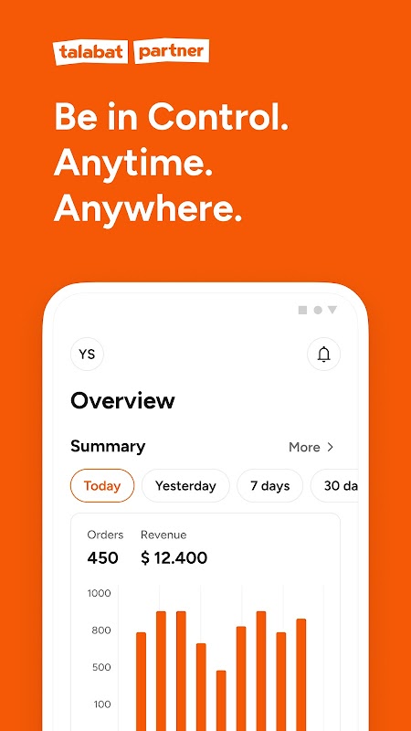 Pożegnaj się z kłopotami związanymi z zarządzaniem firmą z poziomu komputera. Dzięki Talabat Partner możesz zabrać swoją firmę ze sobą, gdziekolwiek jesteś!
