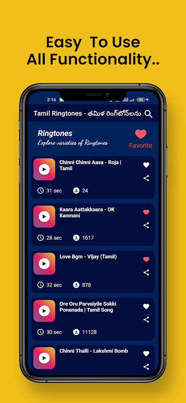Poczuj magię Indii z najpiękniejszymi dzwonkami egzotycznych dźwięków. Jeśli kochasz muzykę tamilską, na pewno pokochasz jeden z dzwonków tamilskich z tej kolekcji na swoim telefonie. Spersonalizuj swój telefon i bądź dumny ze swojego wyboru! Wszystkie główne dźwięki, których potrzebujesz, zostały starannie wybrane, aby pobrać tamilskie dzwonki do ulubionych powiadomień i ostrzec tamilskie piosenki.