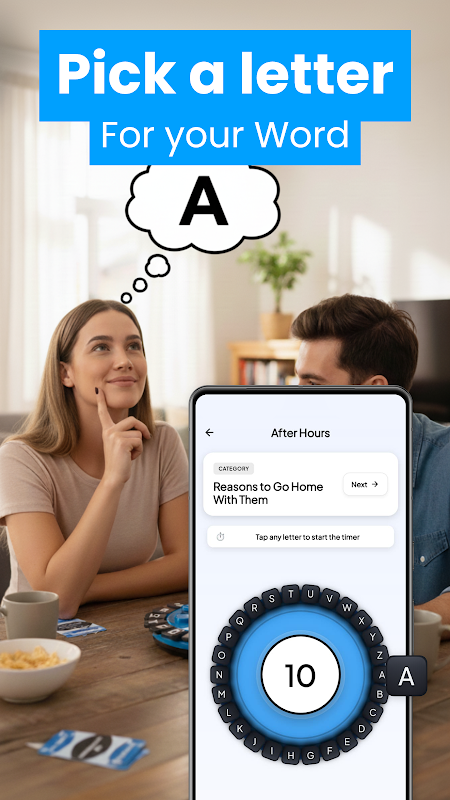Wybierz kategorię, wymyśl pasujące słowo i stuknij odpowiednią literę, zanim skończy się czas. Po użyciu litera znika, więc musisz myśleć szybko i być czujny. Jeśli nie uda Ci się wymyślić słowa na czas, runda kończy się, a emocje rosną.