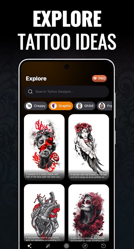 * **Generator tatuaży AI:** Natychmiast zamień swoje pomysły lub słowa kluczowe w unikalne wzory tatuaży.