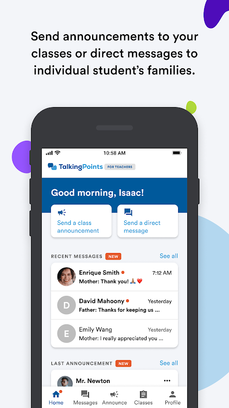 Aplikacja TalkingPoints Teacher pomaga nauczycielom dotrzeć do wszystkich członków rodziny i opiekunów, niezależnie od języka, za pośrednictwem wiadomości tekstowych w ponad 150 językach. Nasze tłumaczenie jest wykonywane przez połączenie ludzkich tłumaczy i maszyn, co umożliwia bezproblemową komunikację ze wszystkimi rodzinami.