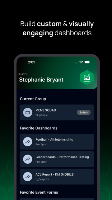 Z łatwością twórz raporty i przeglądaj pulpity nawigacyjne lub profile sportowców/członków usług na smartfonie lub tablecie. Wybierz Ulubione, aby uzyskać szybki dostęp do często używanych raportów, pulpitów nawigacyjnych i wydarzeń. Przełączaj się między grupami i korzystaj z funkcji wyszukiwania, filtrowania i sortowania, aby zawęzić potrzebne dane.