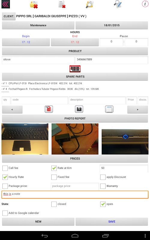 Podczas pomocy, można wprowadzić wiele danych (określenie czy jest to przegląd, konserwacja, wsparcie techniczne lub konserwacja ...), włóż zamienne i dołączyć zdjęcie.