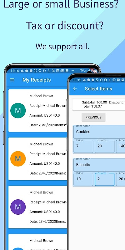 Pisanie paragonów za pomocą tego generatora / generatora paragonów jest bardzo proste. Wprowadź dane klienta, tytuł paragonu, numer paragonu, elementy, wybierz żądany szablon paragonu (smak paragonu) i paragon Teleprinter pobierz paragon z naszego serwera. Nie martw się o swoje dane, aplikacja zapisuje je, więc wystarczy wprowadzić go tylko raz i edytować do woli.