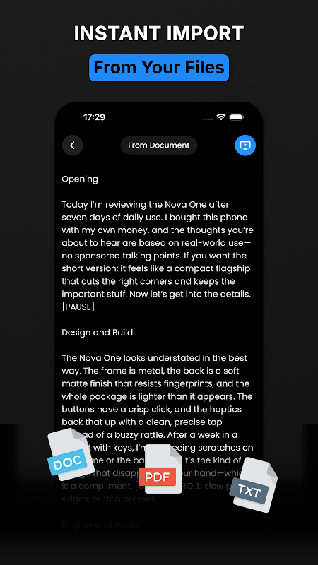 📄 Łatwy import i edycja skryptów. Nie trać czasu na pisanie na małym ekranie. Natychmiast importuj skrypty promptera z plików PDF, DOCX i TXT. Możesz edytować swoje skrypty w aplikacji i zapisać nieograniczoną liczbę projektów na kolejną sesję nagrywania wideo.